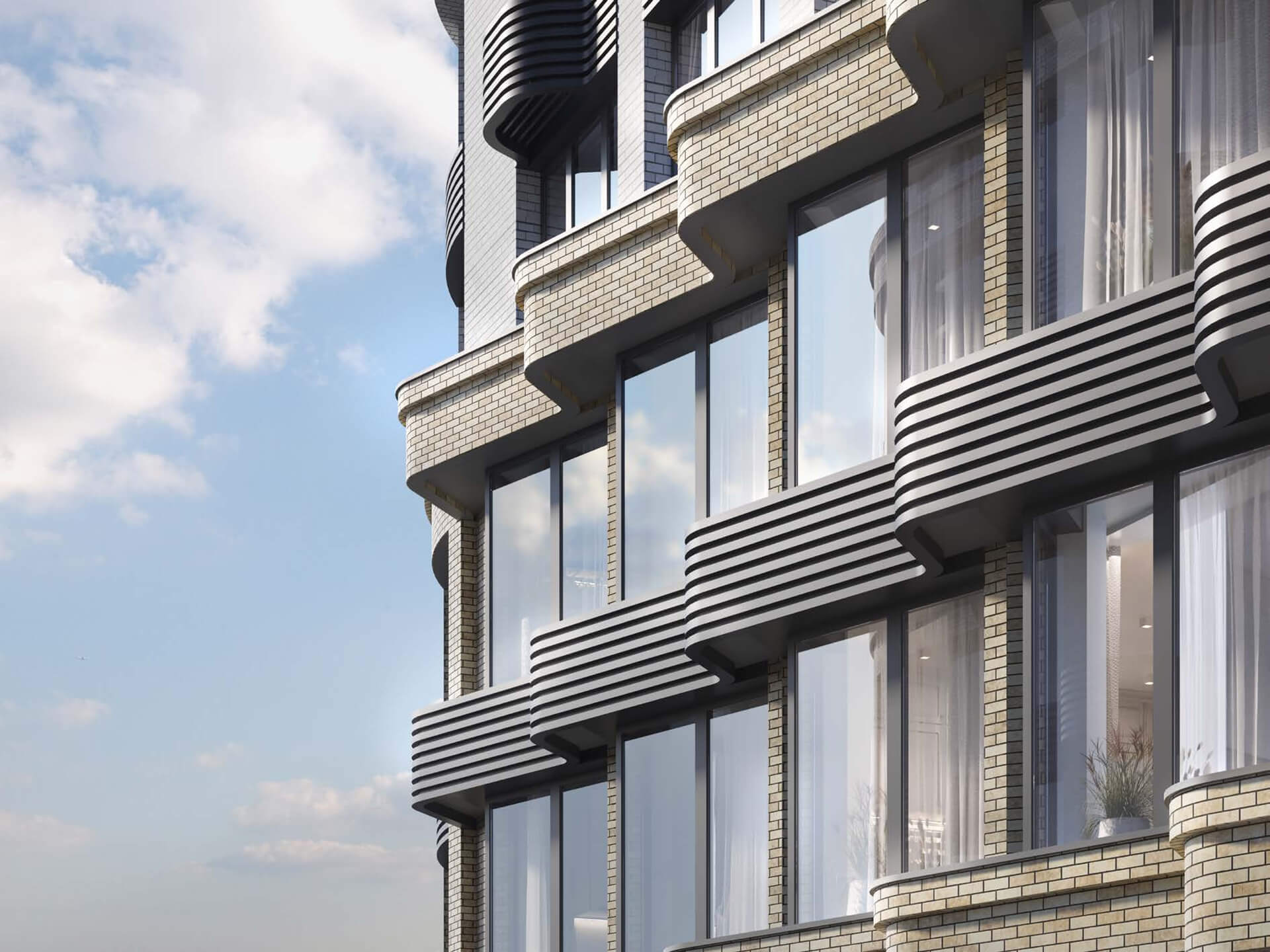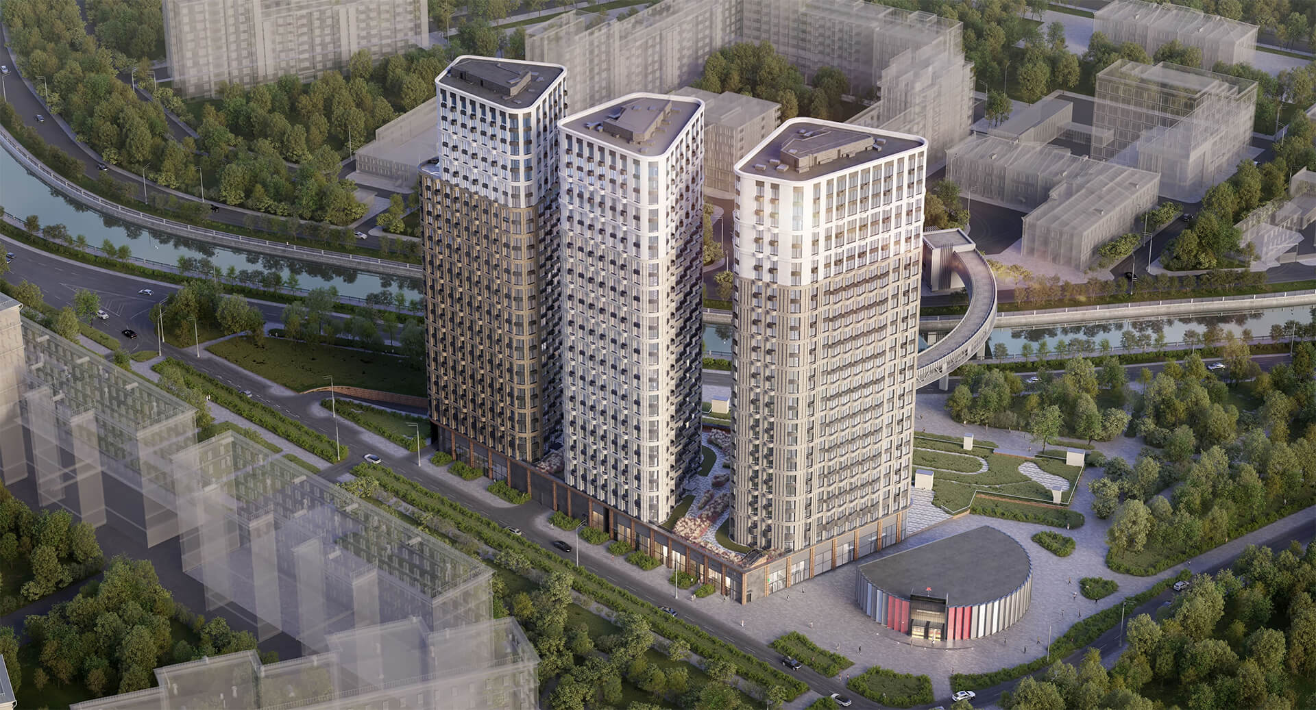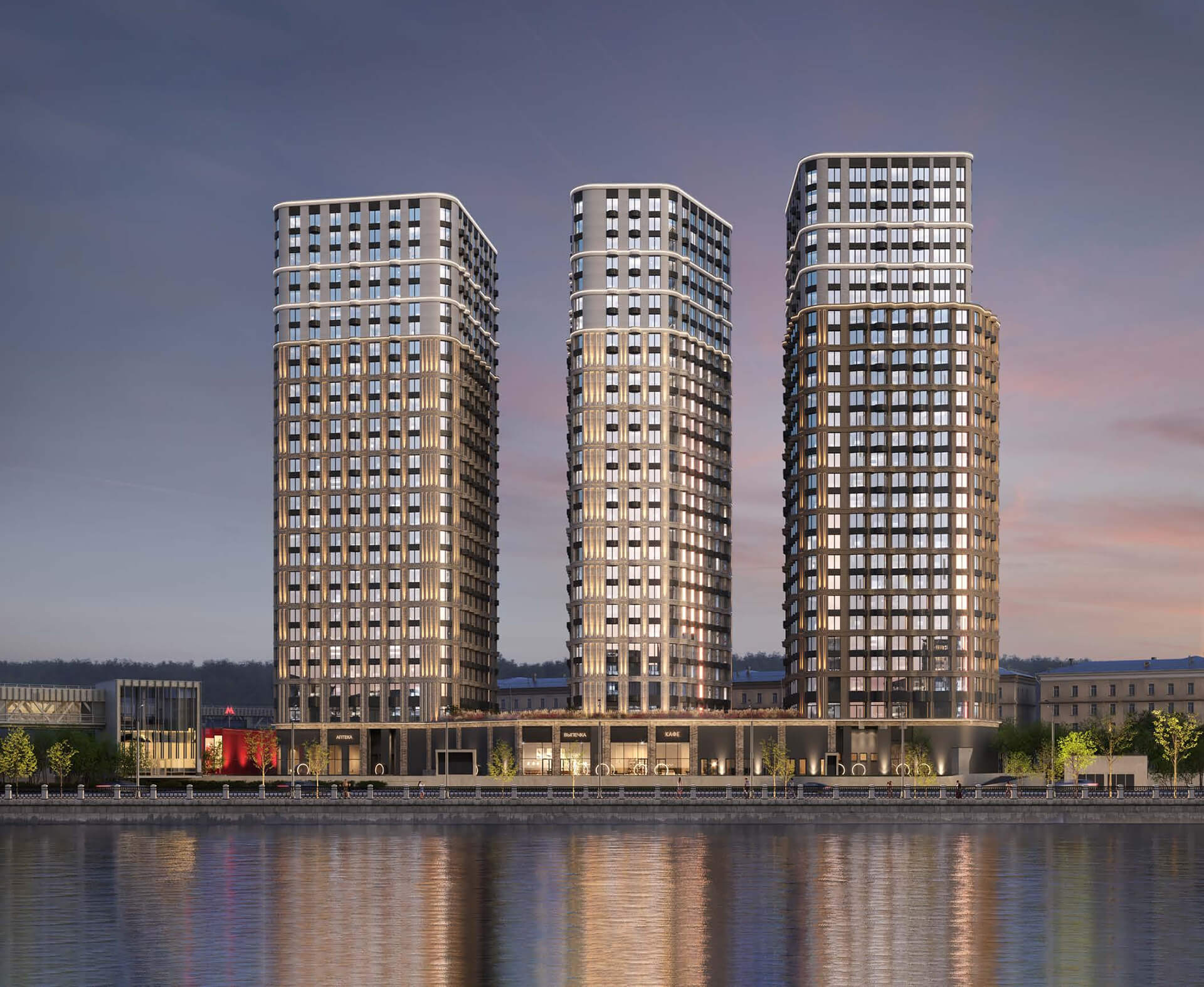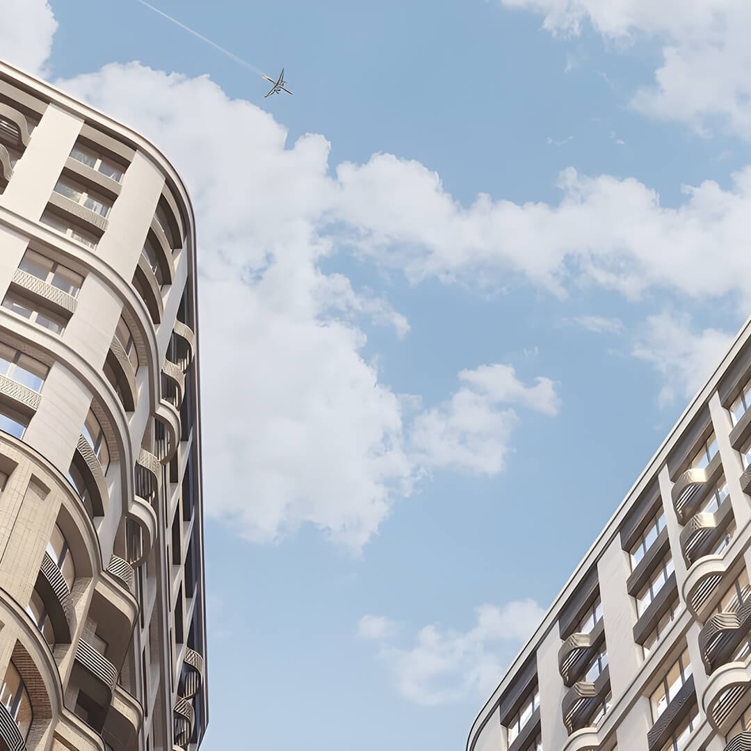 Облик комплекса выделяется на фоне городской застройки: лаконичные формы, вертикальные ритмы и сложная геометрия остекления создают уникальный силуэт. Это архитектура нового поколения, рассчитанная на взыскательную аудиторию, стремящуюся к гармонии внешнего и внутреннего пространства. Каждый корпус спроектирован с учётом инсоляции, приватности и видовых характеристик.