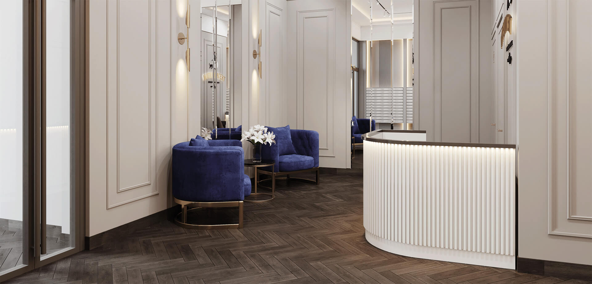 Входные группы жилого комплекса «Интеллигент» — это продолжение общей философии утончённого и благородного пространства. Высококлассная отделка лобби подчёркивает статус проекта и создаёт первое впечатление, соответствующее уровню премиального жилья. В оформлении используются натуральные материалы, приглушённые цвета, дизайнерская мебель и освещение, продуманное до мелочей.