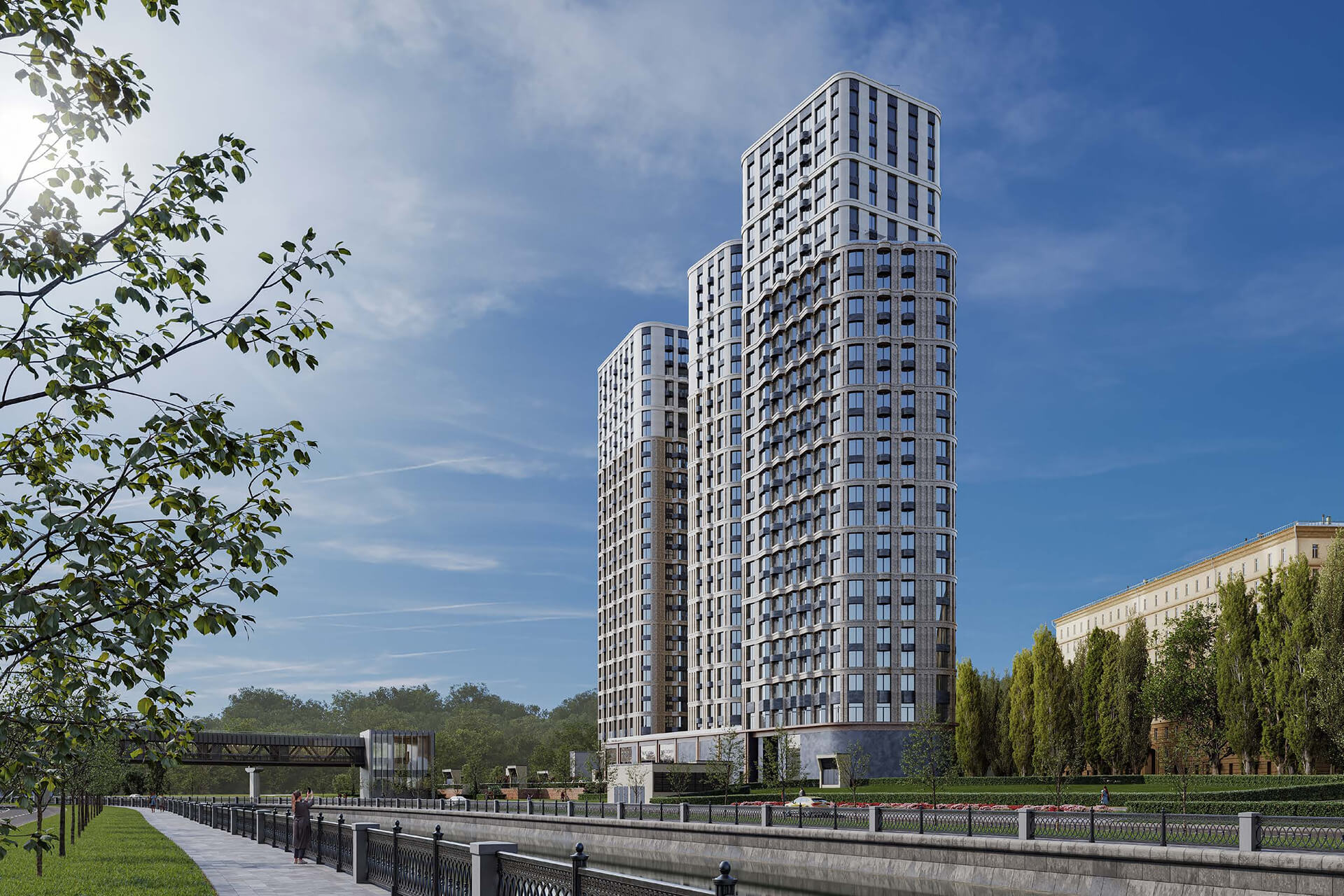 Облик комплекса выделяется на фоне городской застройки: лаконичные формы, вертикальные ритмы и сложная геометрия остекления создают уникальный силуэт. Это архитектура нового поколения, рассчитанная на взыскательную аудиторию, стремящуюся к гармонии внешнего и внутреннего пространства. Каждый корпус спроектирован с учётом инсоляции, приватности и видовых характеристик.